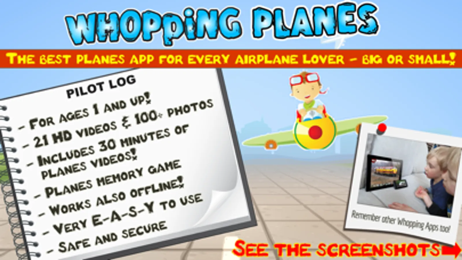 Whopping Planes is a simple entertainment app with games and videos for small kids and toddlers, delivering endless fun with Airplanes, Jet planes, helicopters and everything that flies, lands and takes off! The app is 100% free to use forever. Whopping Planes offers tons of videos and photos and an awesome train themed memory game all in one toddler-sized app for iPhone or iPad. It's made for little fingers (ages 1+) to explore on their own, and works without an internet connection so you can take the fun anywhere!