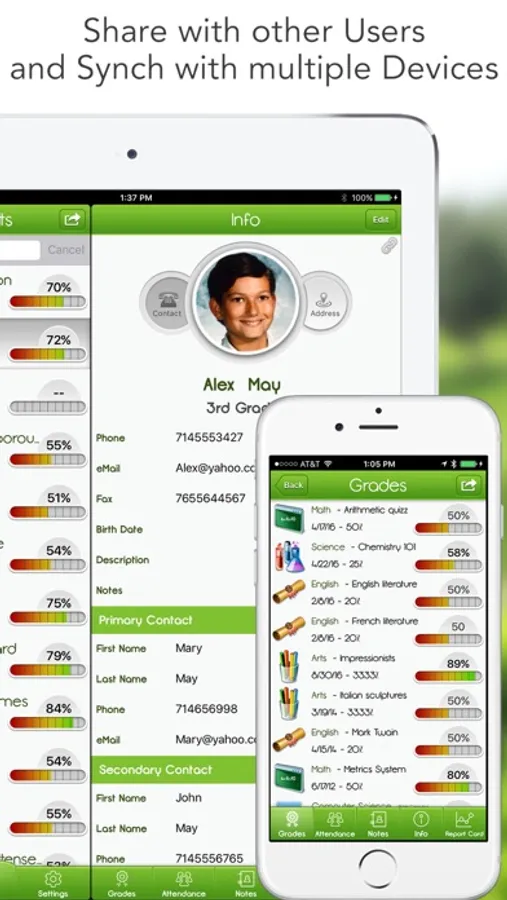 iGrade is the Top Collaboration GradeBook allowing Teachers, Students and Parents to keep track of Grades, Notes, Behavior and Attendance Information. It can be used autonomously by a single user or synchronized and in real time between multiple users. iGrade works online or offline and is compatible with all iPhones, iPods and iPads.