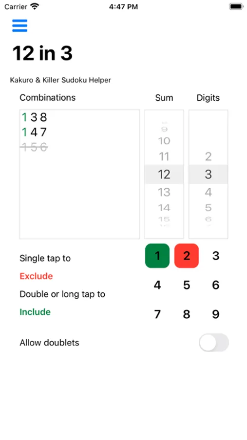 “12 in 3” is a small helper app to determine the possible combinations of a given sum in a given number of digits. You may also exclude certain numbers from the list or make a number to be required.