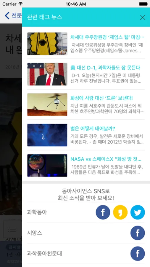 모바일 앱을 통해 최신 과학뉴스와 스페셜한 연재기사 등 동아사이언스가 제공하는 우수한 과학 콘텐츠를 실시간 만나보실 수 있습니다.