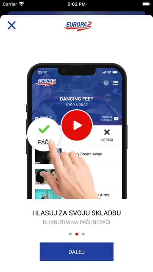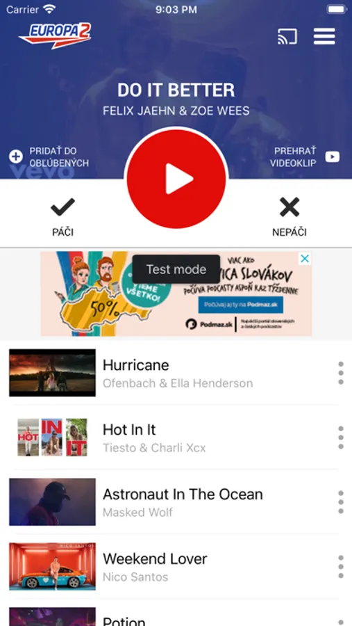 Skladbu, ktorú práve hráme, si môžeš pridať k obľúbeným a ohodnotiť. Tým ovplyvníš vysielanie rádia Europa 2 (žiadne tvoje osobné údaje sa pri tom nezbierajú). Každú skladbu môžeš hodnotiť každé 2 týždne.