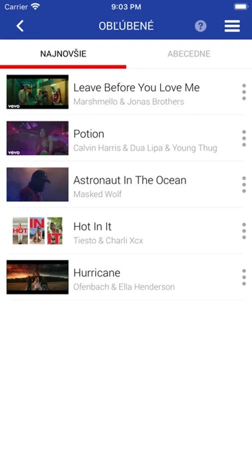 Zoznam skladieb, ktoré si si pridal medzi svoje obľúbené. Môžeš si ich zoradiť od najnovšieho alebo abecedne. Skladby si môžeš takisto prehrať, každá skladba sa prehrá ako YouTube video.