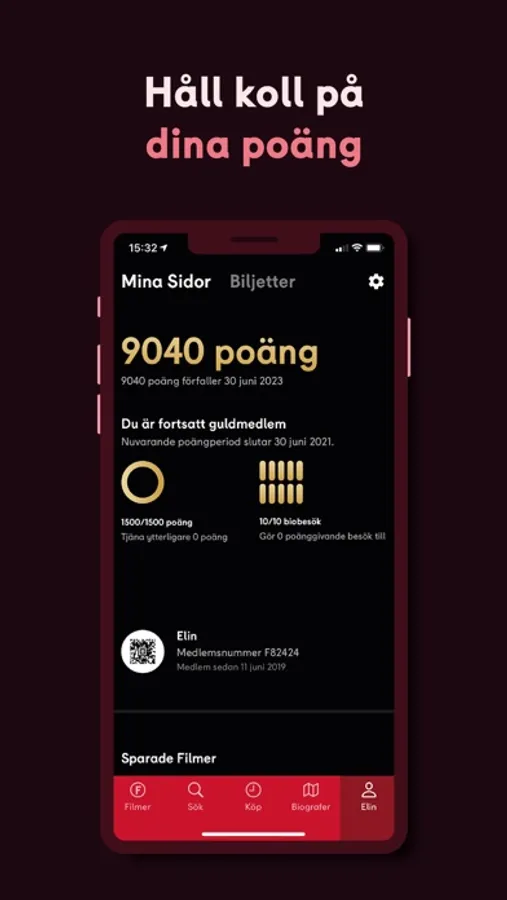 Appen erbjuder inte bara det snabbaste sättet att köpa biobiljetter på, utan som medlem i Filmstaden får du dessutom hela ditt medlemskap direkt i mobilen - komplett med alla grymma medlemsfunktioner. Genom att logga in som medlem samlar du poäng automatiskt när du köper din biobiljett och du har möjlighet att intressemarkera filmer som du är nyfiken på, favoritmarkera din närmaste biograf och fördela poäng till vänner, samt ta del av fantastiska medlemserbjudanden. Din biljett sparas dessutom direkt i appen. Bra va?