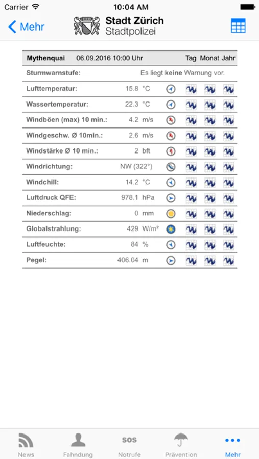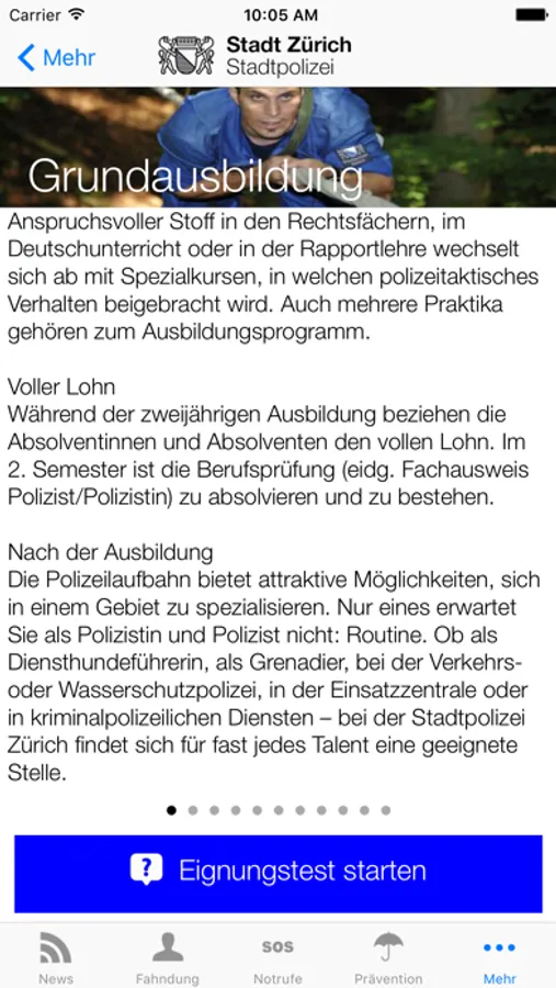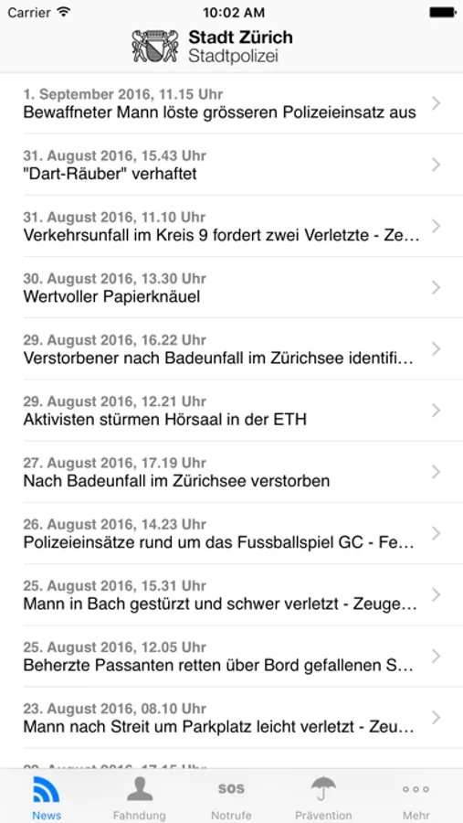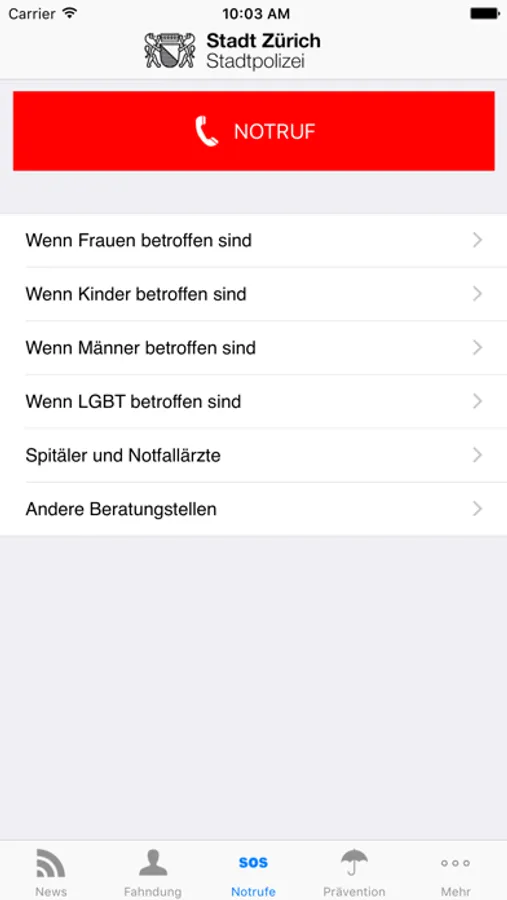 Das App der Stadtpolizei Zürich hält die Benutzerinnen und Benutzer mit News und Fahndungen ständig auf dem Laufenden. Ausserdem weist es abhängig von Ort und Zeit den Weg zur nächsten geöffneten Wache und bietet die Möglichkeit schnell einen Notruf abzusetzen. Das App bietet zudem wichtige Präventionstipps und umfangreiche aktuelle Wetterdaten.