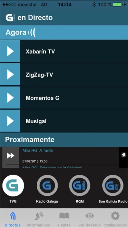 - Nova sección "G en directo" con eventos de actualidade informativa e deportiva. Segue os directos desde o teu móbil, coa funcionalidade de "avísame" poderás programar os eventos de interese para que non os perdas.