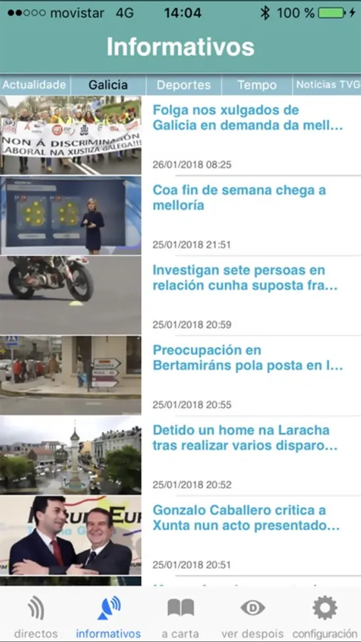 -Informativos da Televisión de Galicia. Acceso a diferentes temáticas: deportes, Galicia, mundo e o tempo
