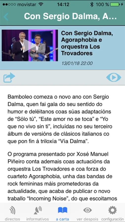 Segue o contido do servizo de á carta con todas as novidades dos programas da TVG, a actualidade informativa da televisión e a radio autonómicas de Galicia e os seus directos.
