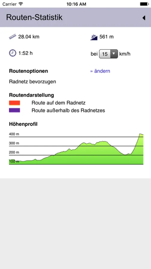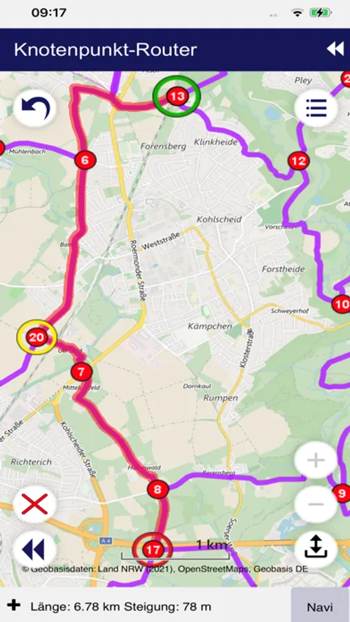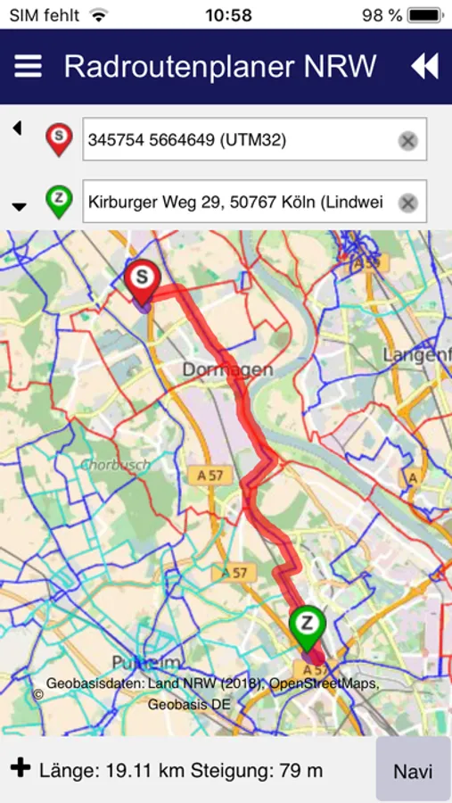Die App bietet auch eine Navigation (Routenführung) auf der berechneten Route. Diese Navigation