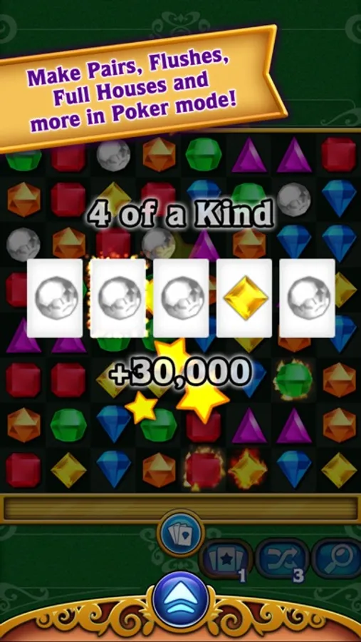 Enjoy the original in Classic, race against time in Lightning, dig deep for treasure in Diamond Mine, discover your own relaxing retreat in Zen, match gems to save Butterflies from a hungry spider in Butterfly, keep the cold out in Ice Storm, and make top hands with gems in Poker.