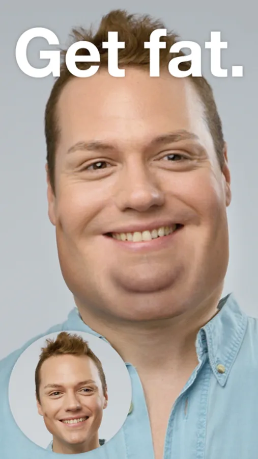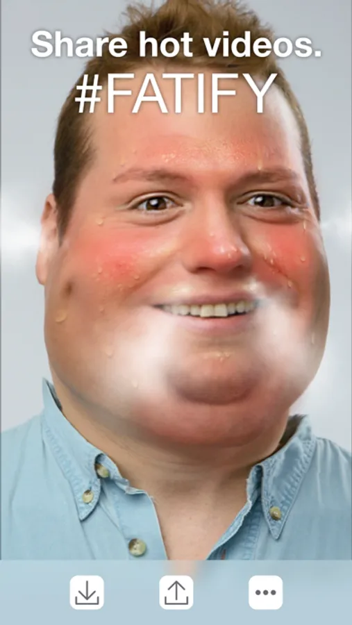 To get fat with Fatify, you just look at your phone's front-facing camera and see your fat self reflected right back. Fatify’s free and fun photo booth technology will change you into fat you in real time, with sweat dripping down your face and multiple fat chins! No more wondering, “What will my face look like if it’s fat?”