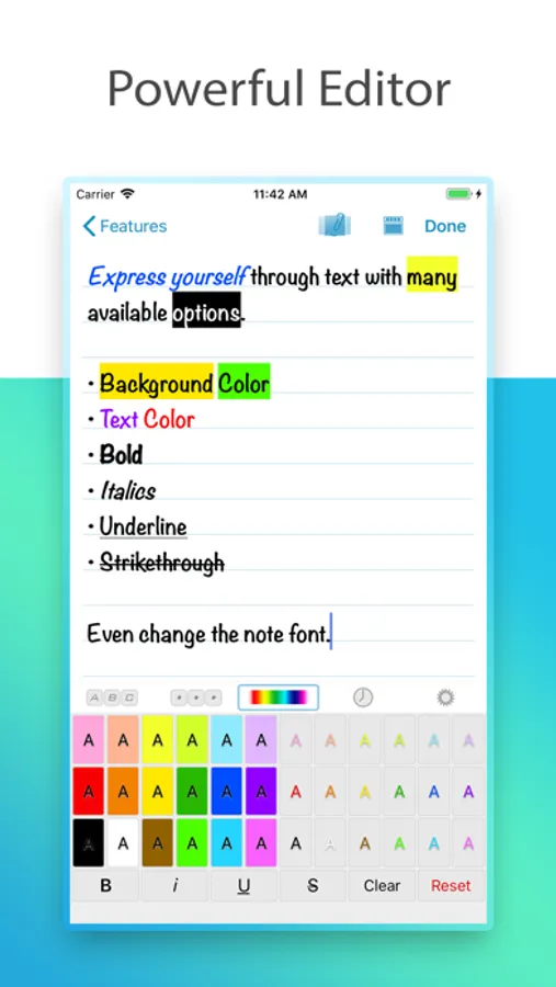 • Text highlighting including Bold, Italics, Underline, Strike text functions