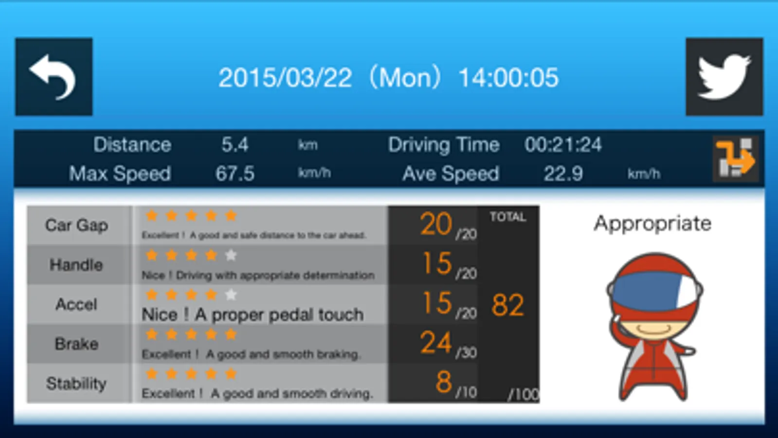 Evaluate the driving in 5 categories namely vehicular gap, handle, acceleration, brake, and driving safeness.