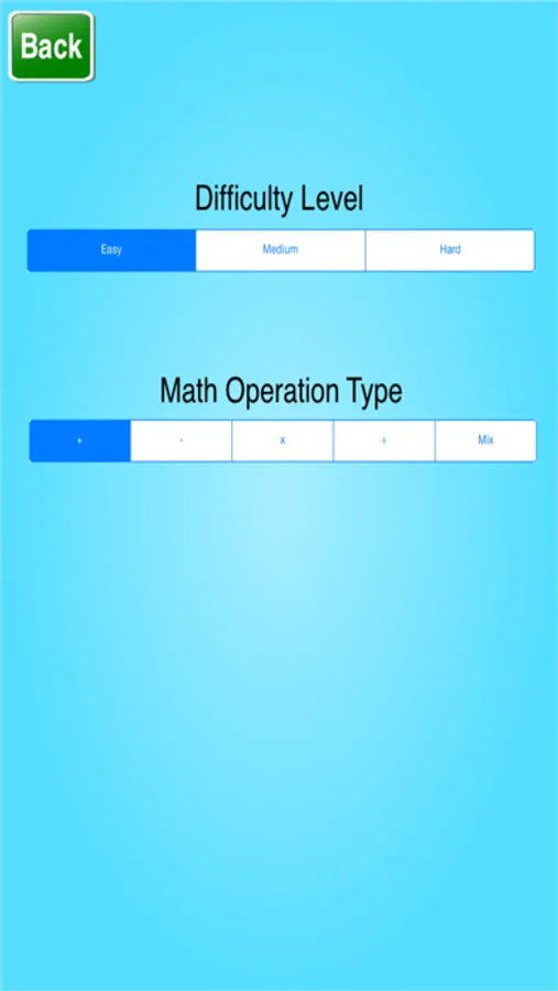 Select the difficulty level and the math operation type in the "Settings" screen.