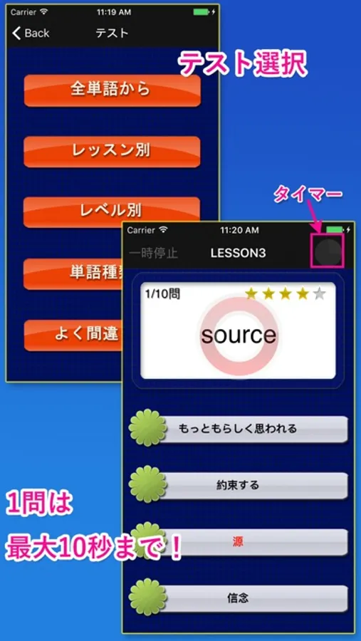 ・テストの最中に一時停止、リトライ機能が付き、間違った単語のみを再テストすることもできます。