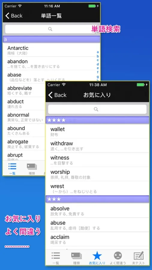 ・「一覧(ABC順)」、「単語種類別」、「お気に入り」、「よく間違う」、「未テスト」5タブがあって、
