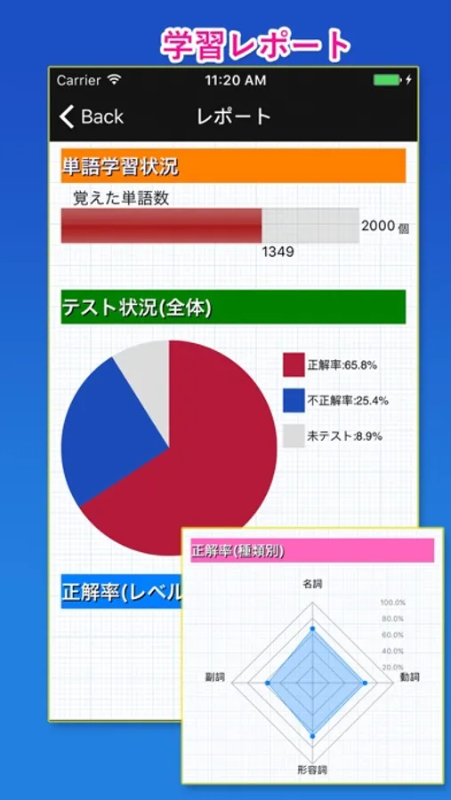・単語レベル及び単語種類別での正解率もチャートで表示され、学