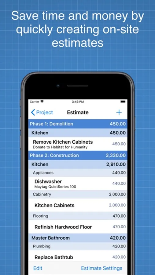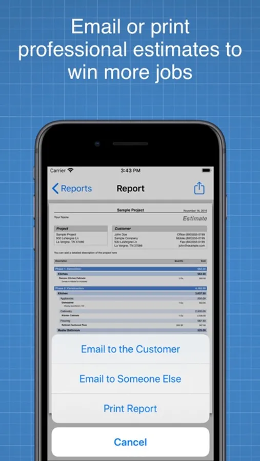 Construction Cost Estimator helps contractors and service companies quickly create on-site estimates for construction and repair projects. You can save time and money by creating the estimate on the spot and then emailing it to the customer as a PDF or printing a hardcopy.