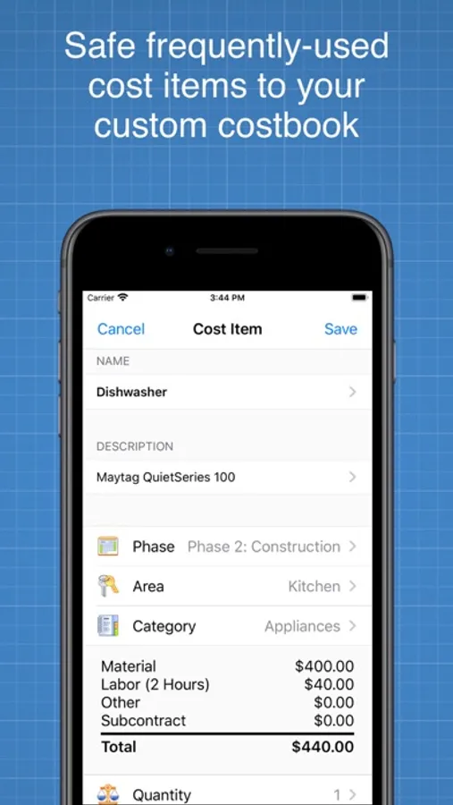 Each cost item is broken down into Material, Labor, Other, and Subcontract costs. You can save frequently used cost items in your own custom costbook, or you can purchase 3 different Craftsman costbooks within the app that contain detailed costs for over 30,000 common construction items.