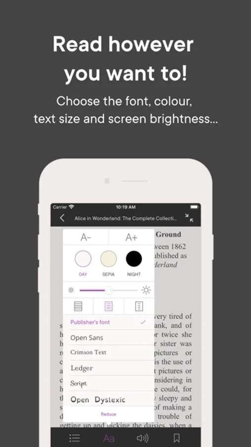 • Need a little more comfort? Listen instead of reading, change the font and text size, switch to night mode or leave a bookmark.