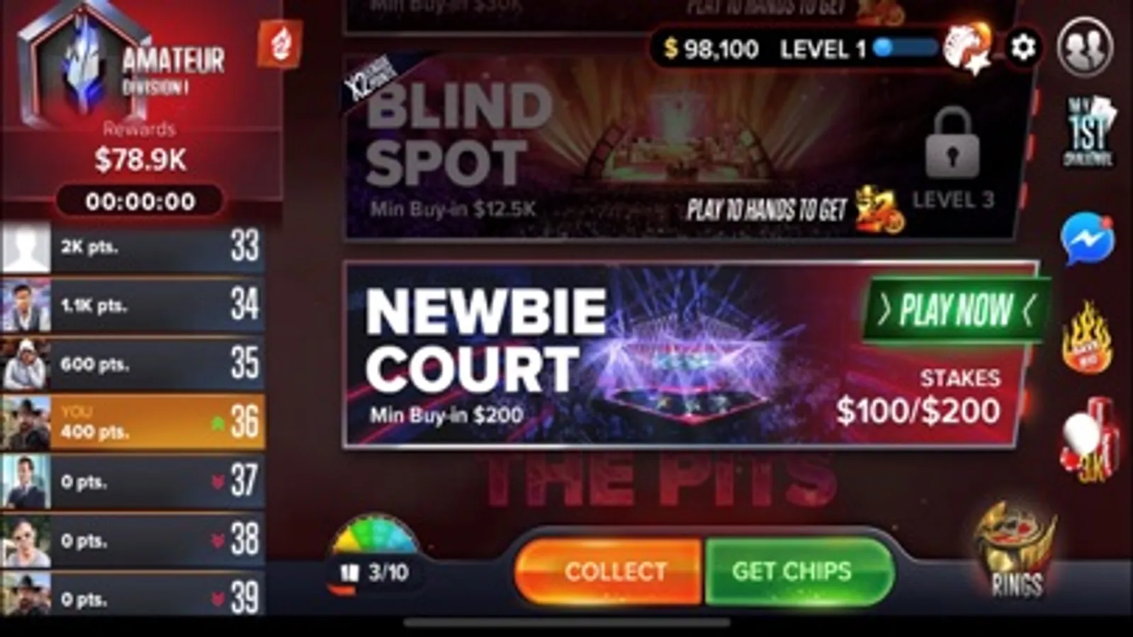 Looking for something more exciting than simple Las Vegas poker games, where you can truly test your poker strategy? Poker Heat’s unique league-based competition with party-like classic poker gameplay gives you intensely competitive gameplay and large variety of online poker rooms, better than any other standard online poker app. Start by playing in the Newbie Court to get into the ‘Promotion Zone’ and progress into the next league. Compete in 10 leagues, bet your free chips online and finish in the top tier to win HUGE PRIZES!