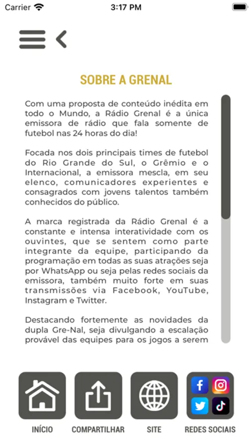 Este aplicativo disponibiliza acesso fácil e gratuito à Rádio Grenal.