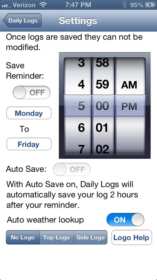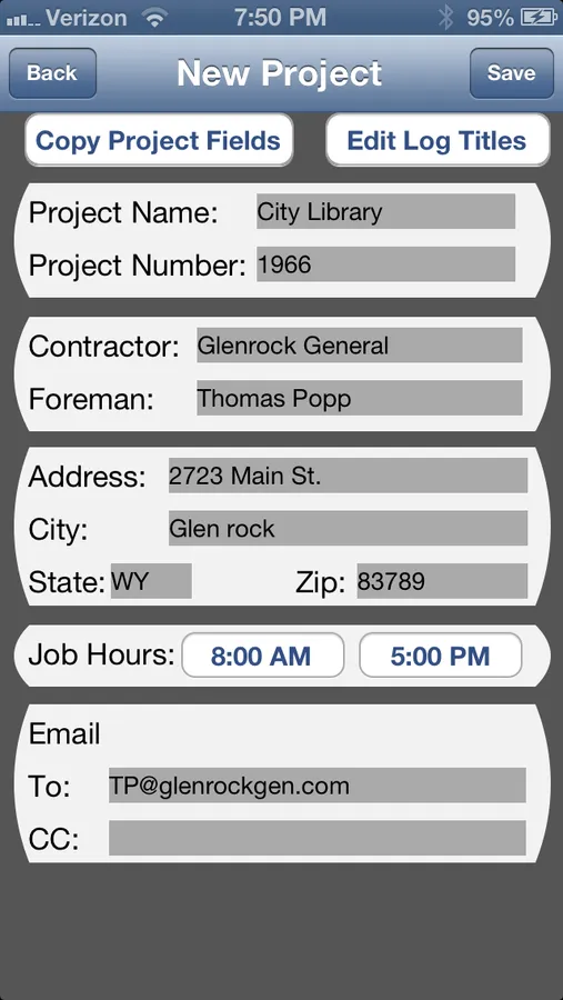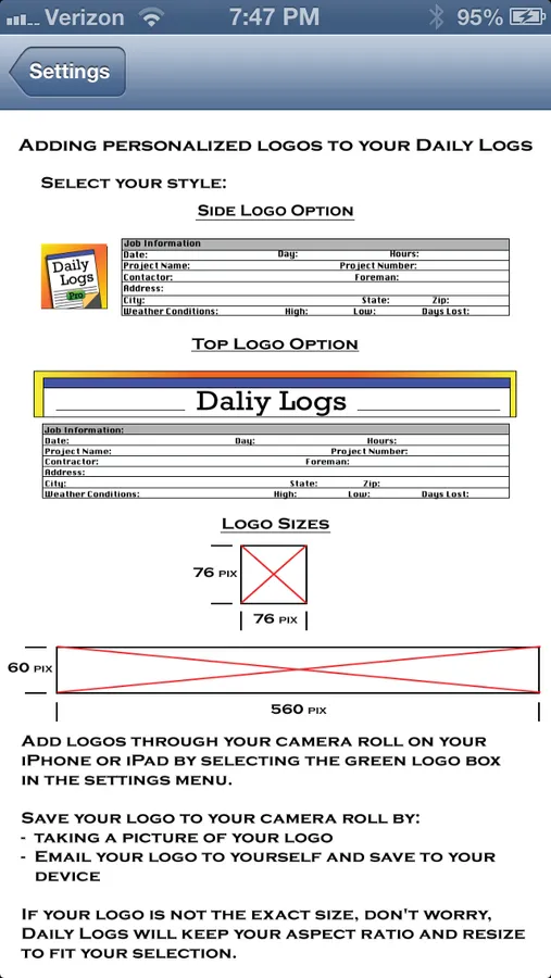 Input an email for yourself or your supervisor to send your logs to each day, your filled out Daily Log will be sent as a PDF. These Daily Logs will be easy to store, print, and sort through in your email account. You will need email set up on your device to take full advantage of this app.
