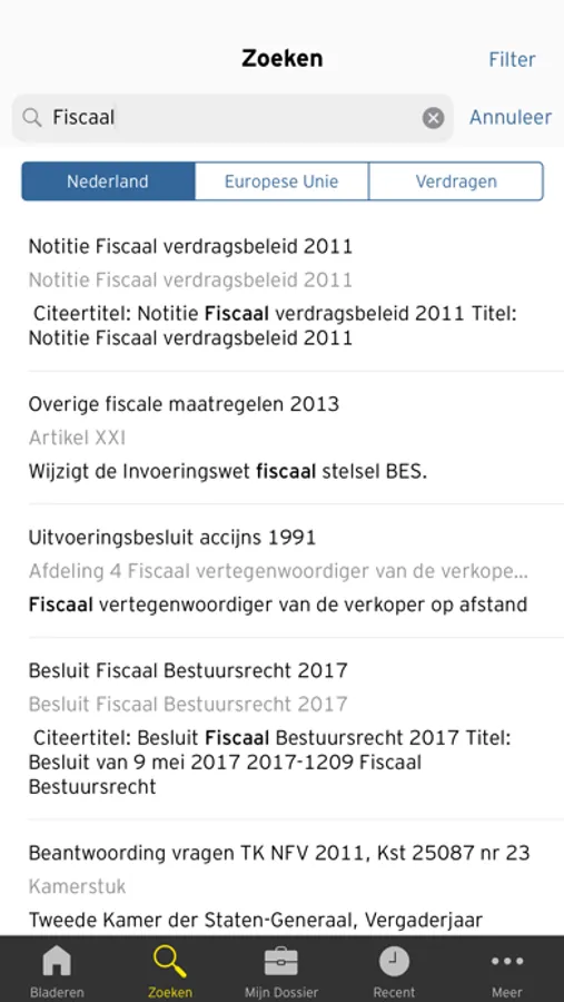 * het full text doorzoeken van de verdragen en wet- en regelgeving met daarbij filters om het zoekgebied nader af te bakenen;
