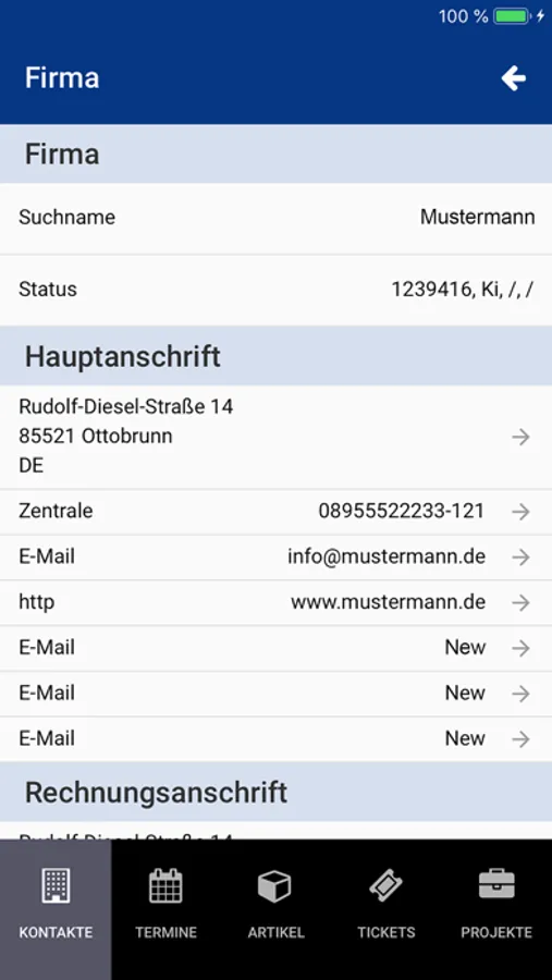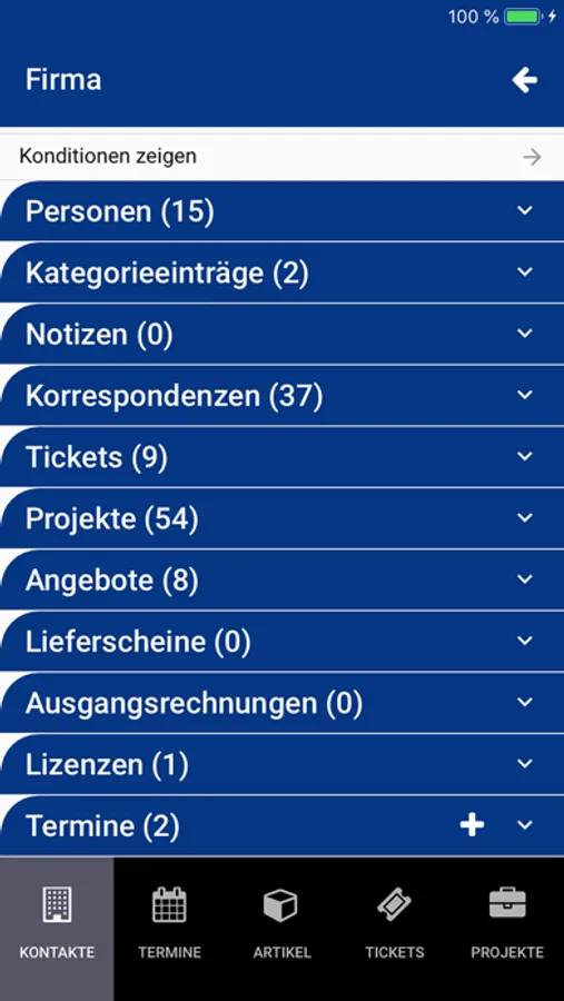 • Anzeige aller aktuell eingetragenen Kategorie-/CRM-Einträge, Notizen, Korrespondenzen, Servicetickets, Projekte, Angebote, Aufträge, Lieferscheine, Ausgangsrechnungen