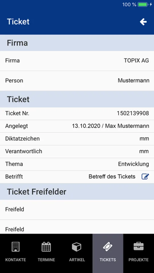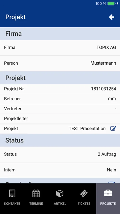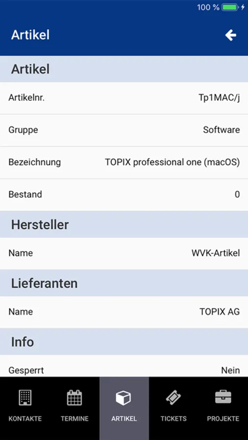 √ Der TOPIX iOS-Client bietet direkten Online-Zugriff auf zentrale Unternehmensdaten des ERP/CRM-Systems TOPIX mit Abfrage von detaillierten Firmen-, Personen-, CRM-, Termin-, Projekt-, Korrespondenz-, Vorgangs-und Serviceticket-Informationen sowie Artikel- und Preisinformationen.