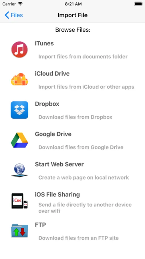 - iTunes File Sharing: Copy files to and from iCue using iTunes.