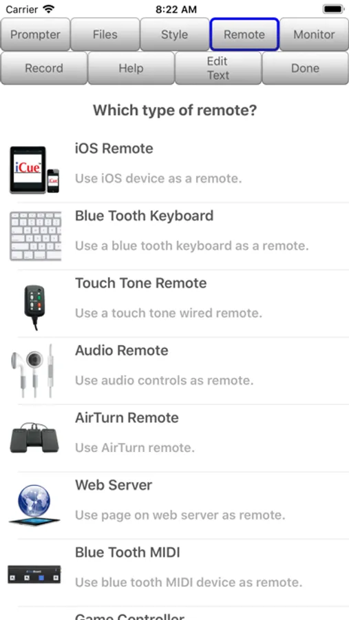 - Blue Tooth Keyboard: Assign keys of a blue tooth keyboard to control prompter features.