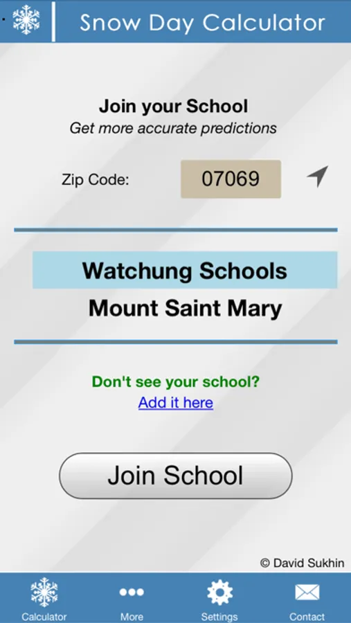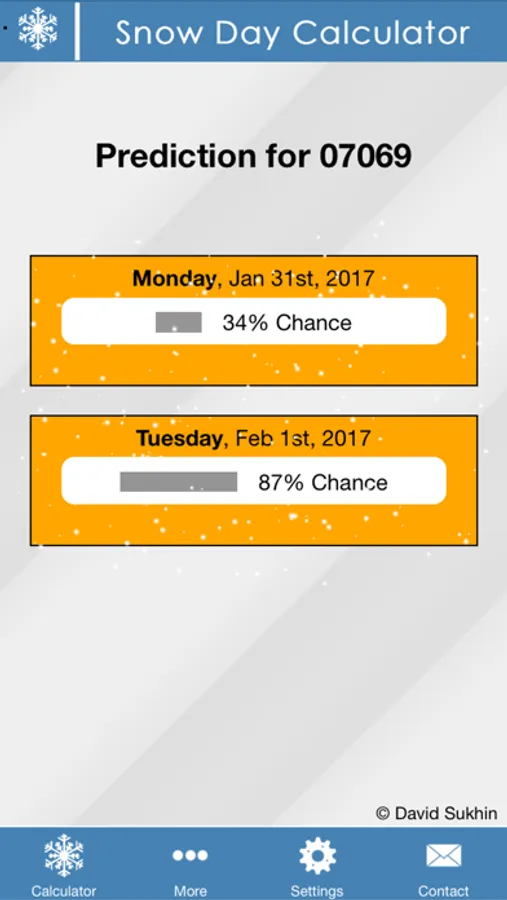 Get the prediction power of the Snow Day Calculator in an App. Using just your zip code, David Sukhin's famous Snow Day Calculator will predict the chance of a snow day.