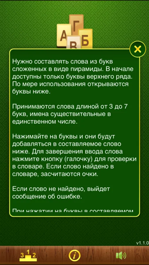 Захватывающая игра на составление слов используя буквы сложенные в виде пирамиды. В начале доступны буквы только верхнего уровня. Чем больше букв будет использовано, тем больше новых букв откроется.