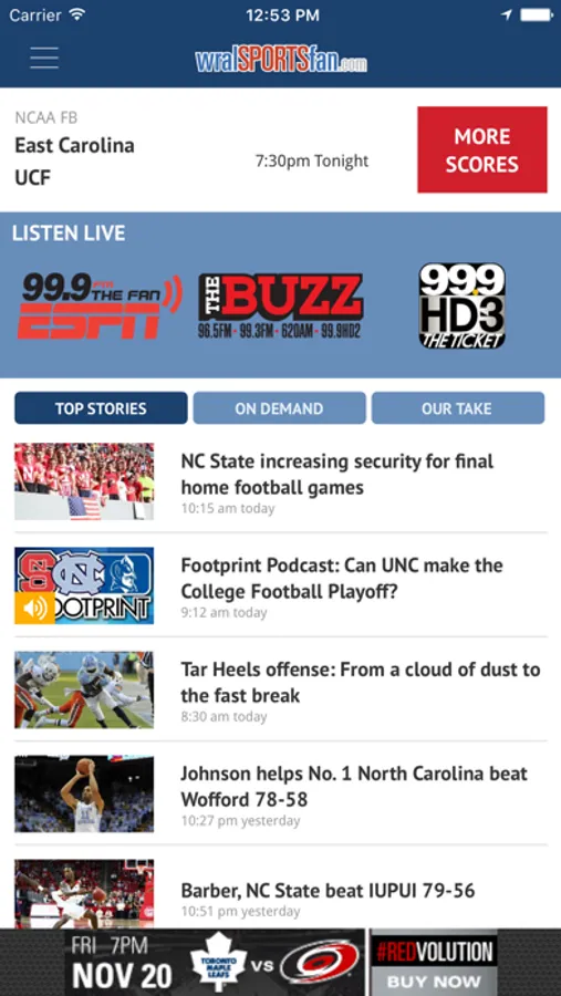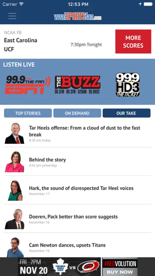 Listen to Adam & Joe, The Sports Shop with Reese & Kmac and David Glenn from 99.9 FM and Buzz Sports Radio while you check out the latest sports news from WRALSportsFan.com. Watch interviews, read columns and follow your favorite local teams including the NC State Wolfpack, UNC Tar Heels, Duke Blue Devils, ECU Pirates, Carolina Hurricanes, Carolina Panthers and Durham Bulls.