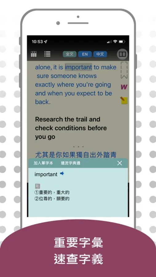 2. 快查字義:內建字典,可快速查詢文章上單字的解釋。