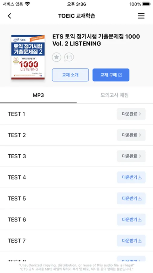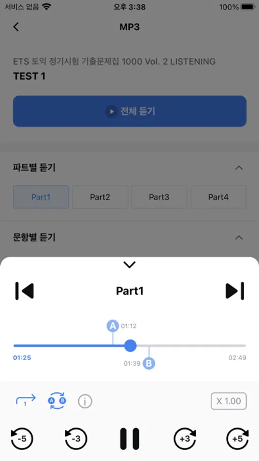 1. 실제 시험 성우가 녹음한 LC 음원 MP3 다운로드 및 앱 내 재생 기능 (속도 조절, 반복 청취)