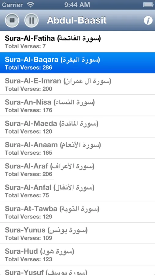Complete Quran recitation audio of Sheikh Abdul Baasit. No further download needed after purchasing the full upgrade. Also supports background audio and remote events.