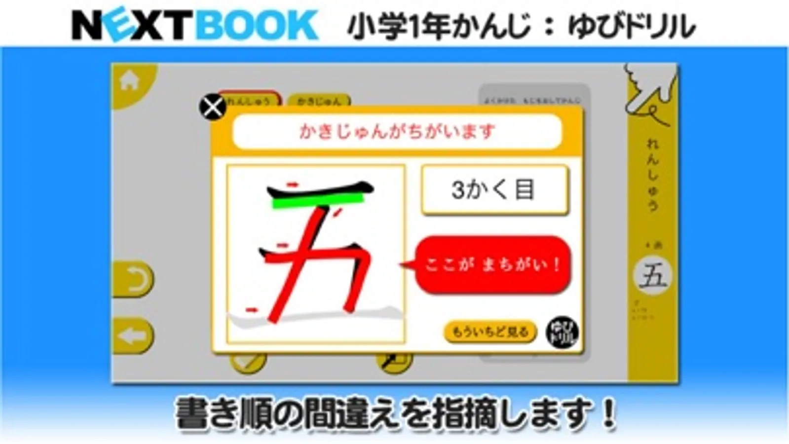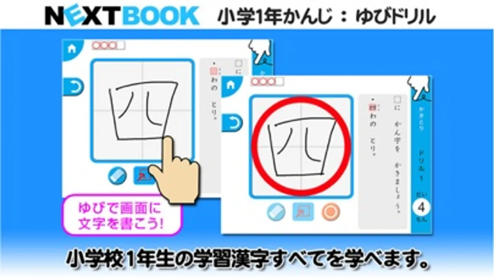 ゆびで画面に漢字を書いて書き取り練習ができるドリル。正しい「書き順」「画数」で漢字を書かないと◯と判定されません。