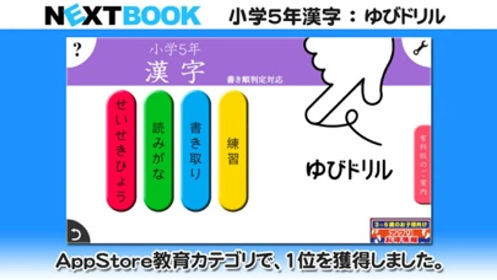 *「小学1年生かんじ:ゆびドリル」は、App Storeトップ教育有料iPad Appランキングで1位を獲得しました。