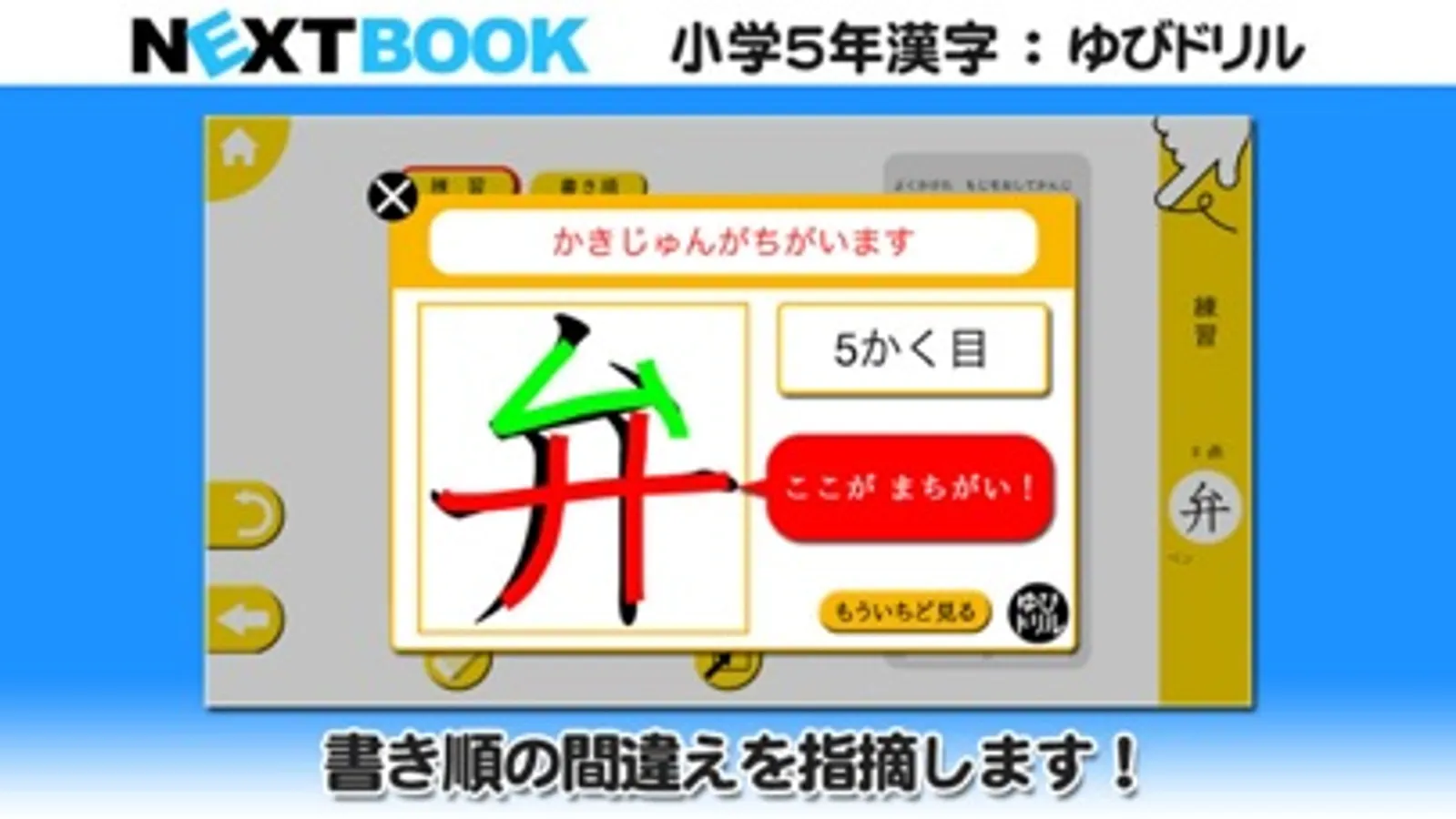 ゆびで画面に漢字を書いて書き取り練習ができるドリル。正しい「書き順」「画数」で漢字を書かないと◯と判定されません。