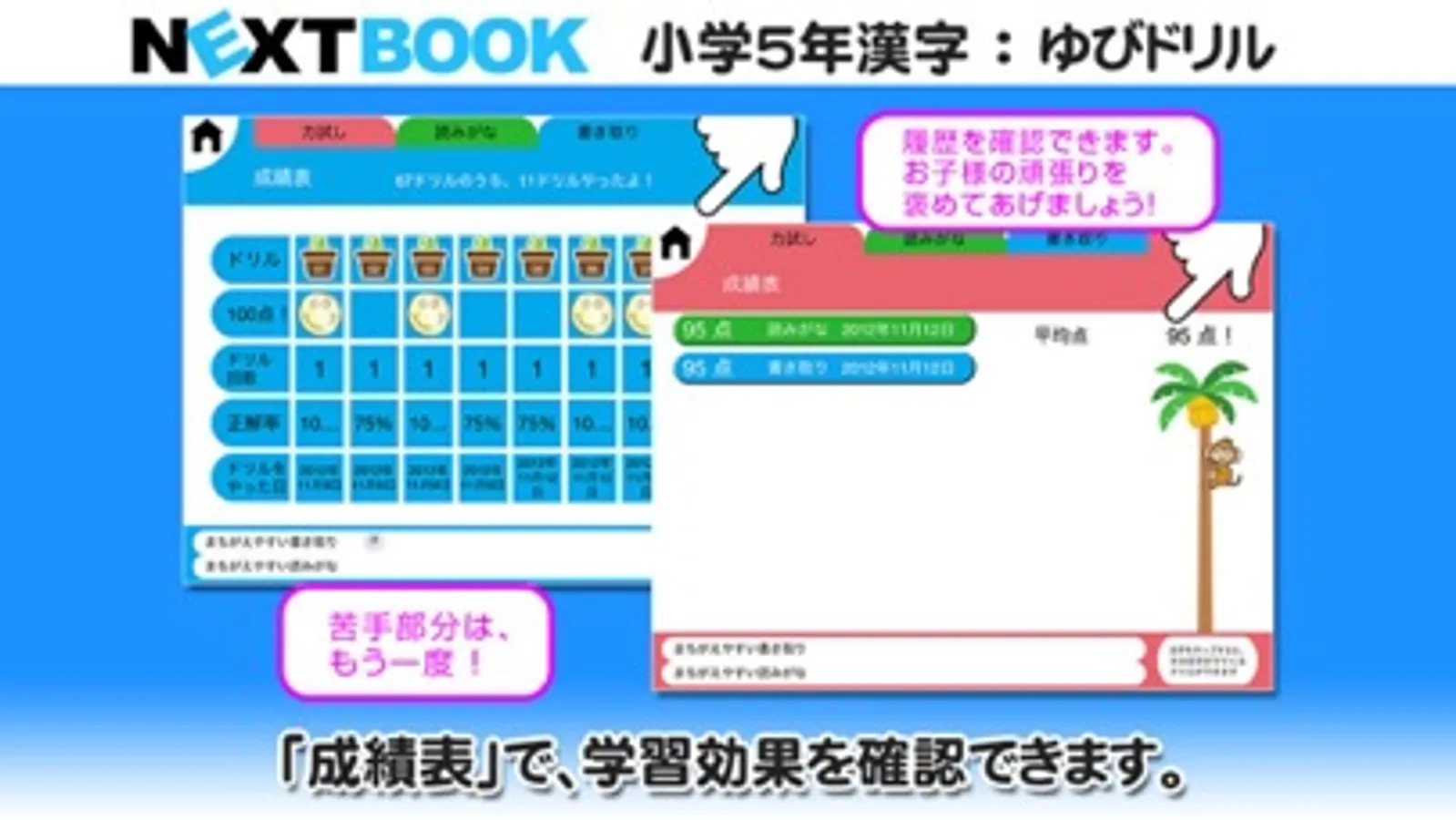 各ドリルとちからだめしを行った点数、回数、日付、正解率が表示され、間違えた漢字、読みがなが表示されます。間違えたドリルを再度学習することが簡単にできます。