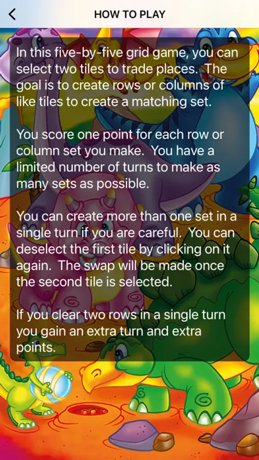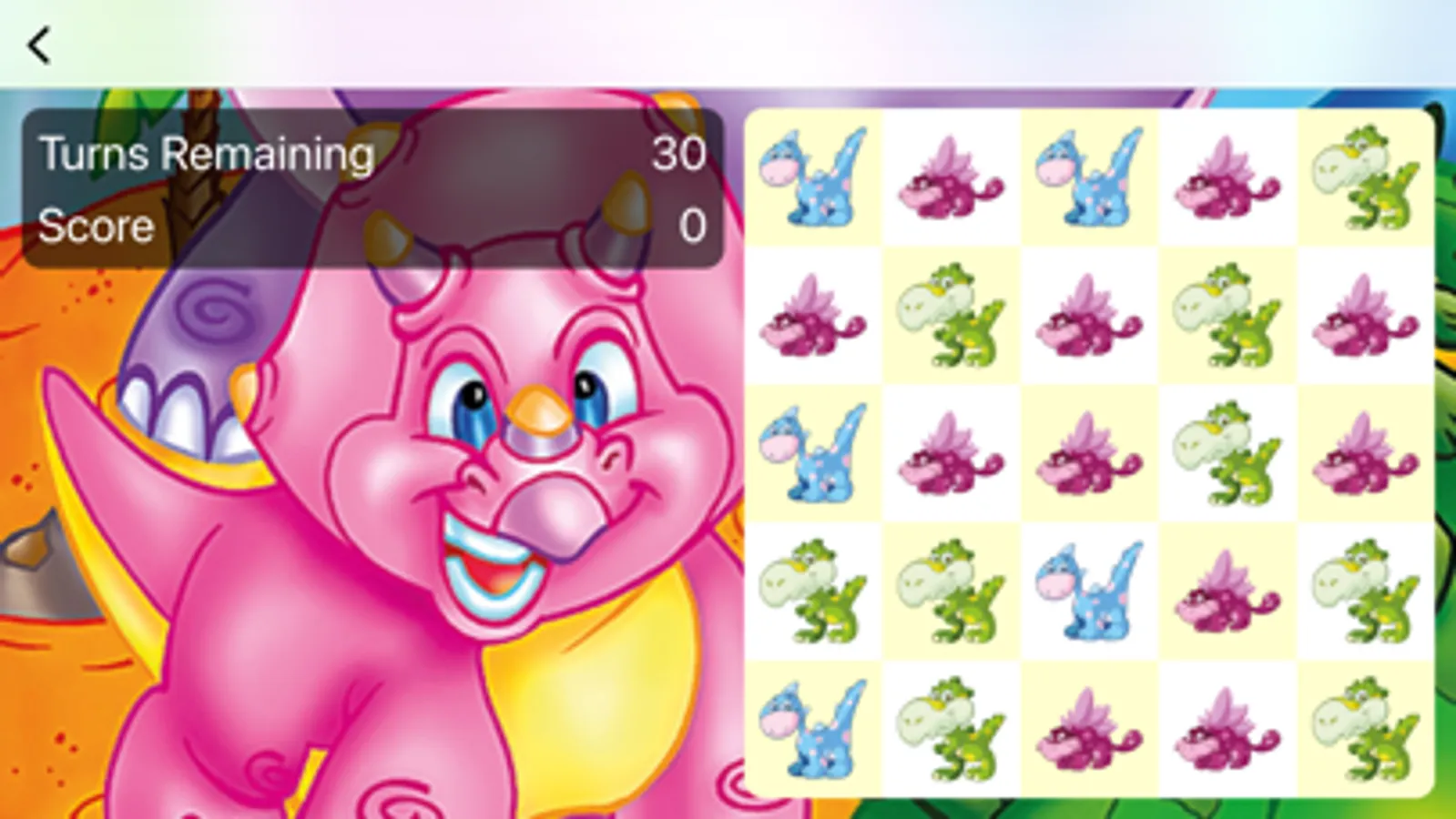 In this five-by-five grid game, you can select two tiles to trade places. The goal is to create rows or columns of like tiles to create a matching set.