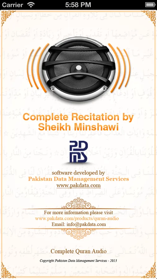 Complete Quran recitation audio of Sheikh Minshawi. No further download needed after purchasing the full upgrade. Also supports background audio and remote events.