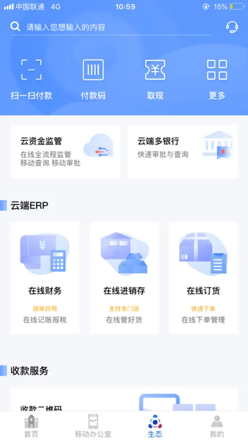 提供账户查询、转账支付、交易授权、银企对账四大常用功能快捷入口。