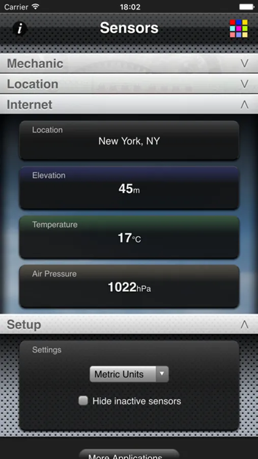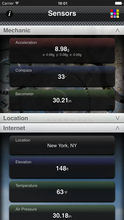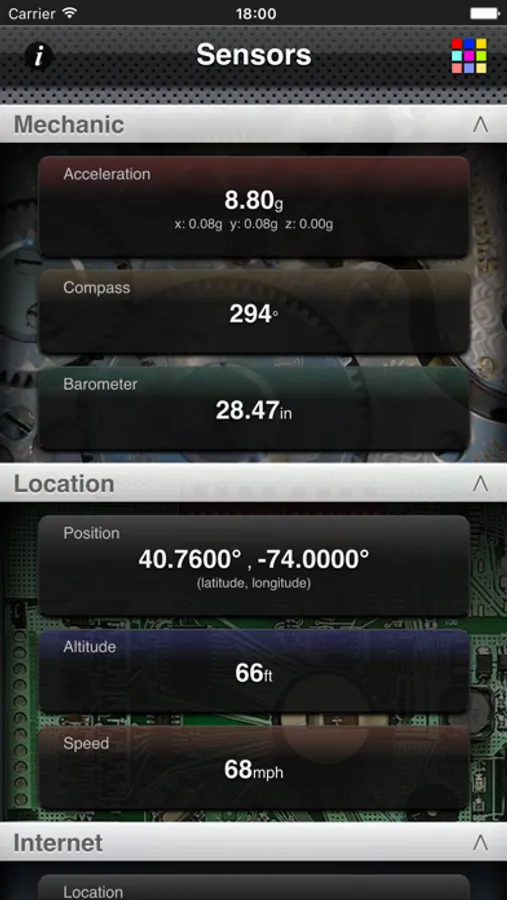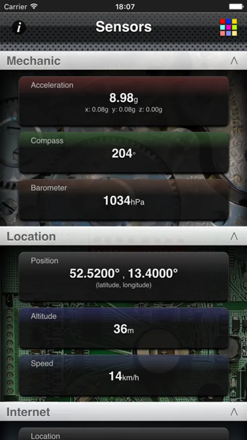 See the values of the built in device sensors all together in one app. Supports (if available) acceleration, heading (compass), pressure, position, altitude and speed.