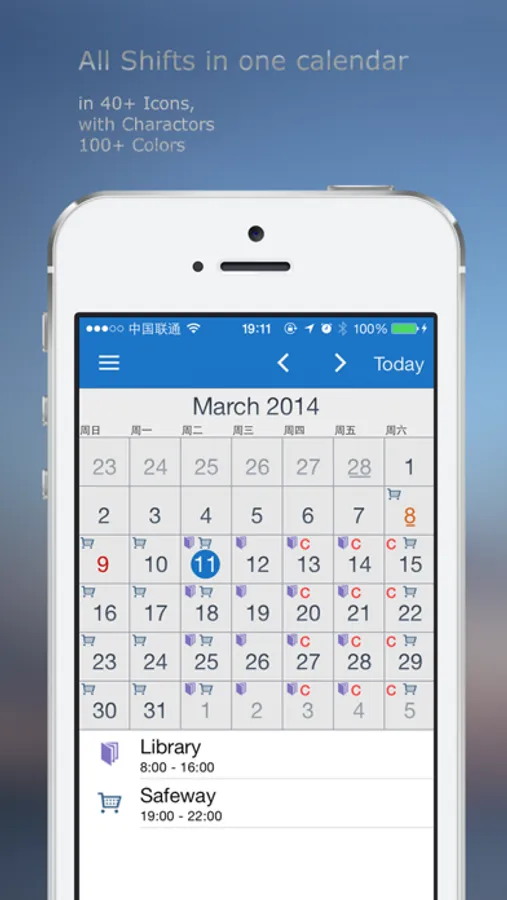 It will show your shift schedule in a calendar with Character or 40+ icons combine with unlimited colors, so it will be very easy to show when you arrange much of shift.