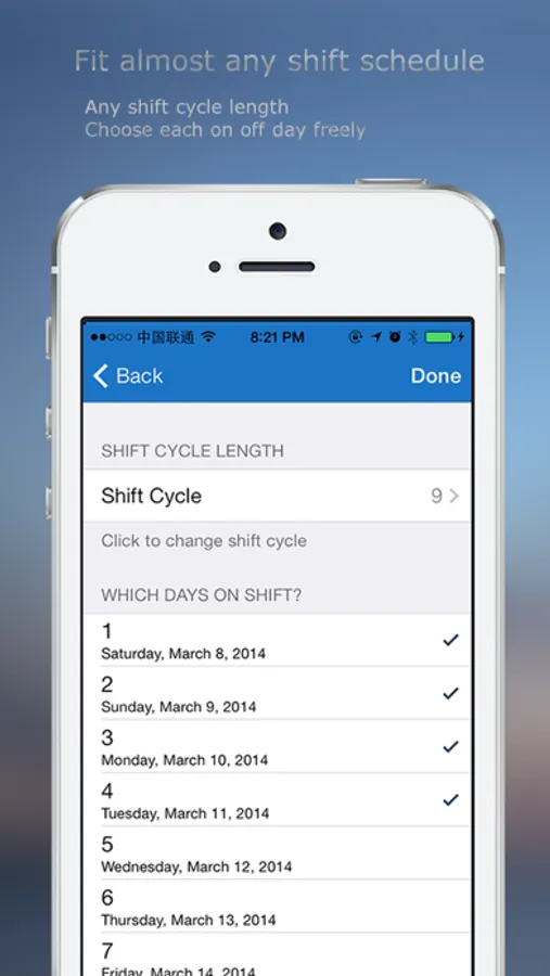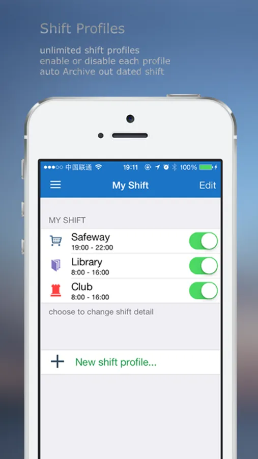 • Unlimited Shift Profile: You can enable or disable the shift in shift list menu, so you don't need to delete any shift configure! disable the shift will let shift not show on your calendar view!