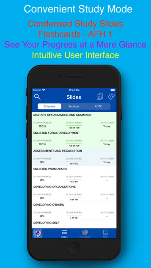 4. ADAPTABLE TO EVERY LEARNING STYLE. Not everyone studies the same way. PDG PROmote provides all of the options you need to study in a manner that works best for you. Want to read the AFH 1 paragraphs? You can. Want to read condensed nuggets of information from AFH 1? You can. Want to study flashcard questions? You can. Want to study flashcard questions but with the answers always shown? You can. Want to listen to the slides, flashcards, or AFH 1 paragraphs on your way to work? You can. Want to listen and read at the same time? You can. Your mission is to master all the testable sections of AFH 1 and no other app offers you as many ways to do that.