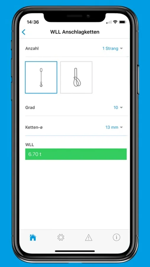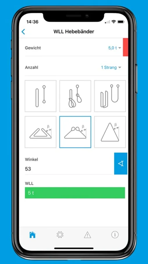 This App provides a combined tool for calculating the β stop angle and the length of the sling to quickly and easily find out whether the maximum permitted β angle stop is adhered to and which length of the sling is to be used in view of the given number of ropes and the given dimensions of the load.