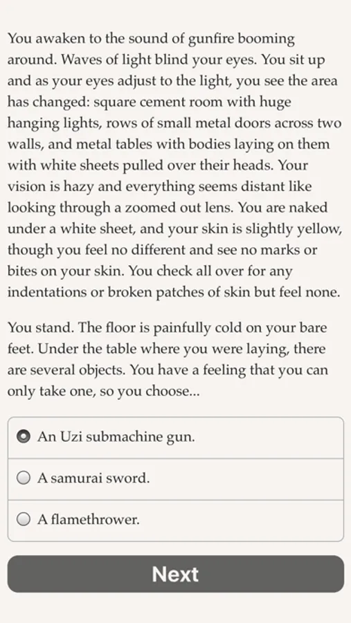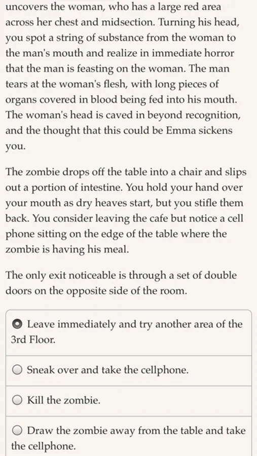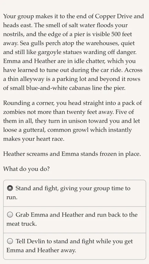 Build your character and fight your way out of a zombie-filled city to save your sister in this text-based horror fiction story. Choose to be a soldier, athlete, carpenter, minister, or scientist. Play as male or female, gay or straight, and even find romance in the Zombie Apocalypse. Gather supplies and weapons while avoiding the military, bandits, and living dead. Your choices alone control the story.